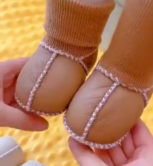 These suede-look sock shoes are perfect for winter walks in the stroller. They fit snugly and never slip off.